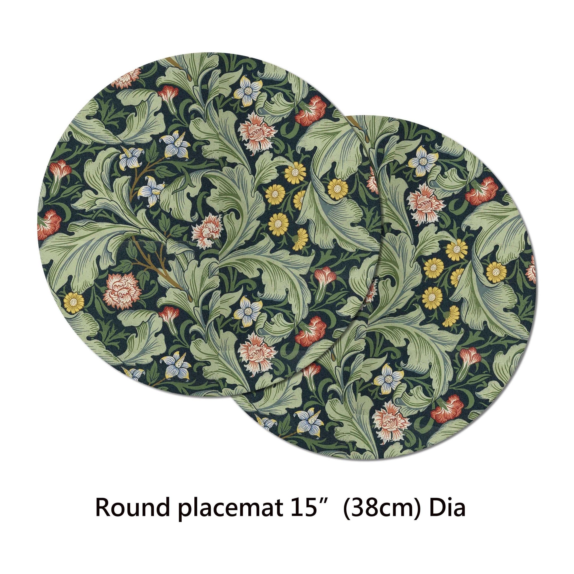 These William Morris leicester placemats are sturdy and flexible with unique basket woven texture to the touch for easy preparation and storage. The wedge placemats are customized to fit your round table. please specify you table size in the options of "Table Size (Diameter)" so we can make the curve of the placemats conform with the curve of your table. Special Features. A) Basket texture to the touch on top,vibrant colors also adds an extra sense of motion and 3D visual effect to the print. B) Turned hem edges, offers high quality aesthetic construction, no peeling off, no cheap cut raw edges. C) The polyester fabric on top is vinylized with multiple layers of coating which creates a strong waterproof surface for you to use it every day. please feel free to contact with us for any information. Specs & Care Round placemat 15" (38cm)Dia Wedge placemat 19"x13" (48cmx33cm) Please advise diameter of your round table! Oval placemat 18"x13" (46cmx33cm) Rectangle Placemat 18"x12" (44cmx30.5cm) Mitered Placemat 18"x13" ( 46cmx33cm) Pebble placemat 18"x13" (46cmx33cm) Square Placemat 14"x13.5" (35.5cmx34.5cm) Wipe-Clean with damp cloth, water, household detergent